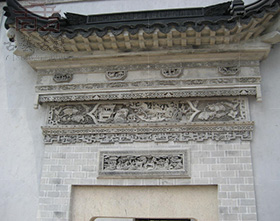 磚雕在使用位置上可以分為墻面磚雕與門戶磚雕。墻面磚雕可分為院墻磚雕、山墻磚雕、檐墻磚雕、廊心墻磚雕等類型。廊心墻是指檐廊下兩端的墻體。廊心墻磚雕施用于墻中心偏上部位,工藝上有陰刻、平雕、鑲嵌等手法...